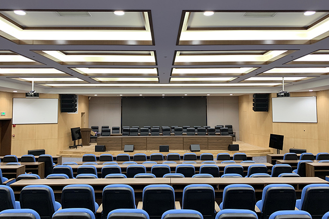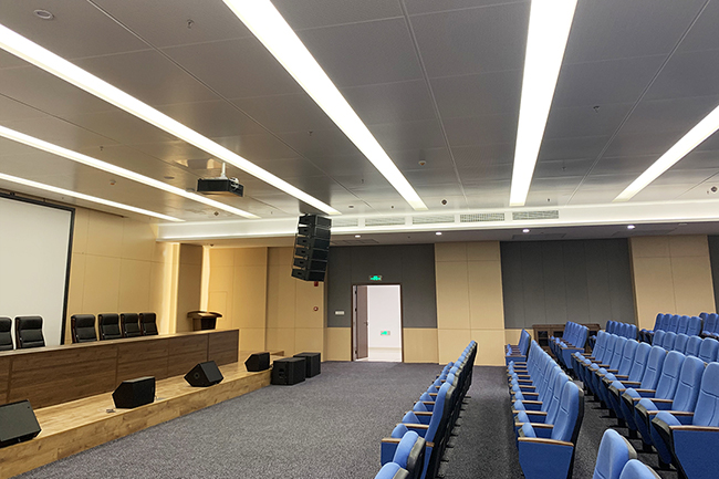由于房间数量较多,根据每间的使用环境结合客户需求及产品性能,最终为一层的学术报告厅、数字影像厅等共选用了20只线性阵列音箱作为主扩声系统,最大声压级高达135dB,所需的倾斜角度也扩张到了最大使用范围,内部喇叭单元的安装角度可满足不同的场地使用需求,搭配单15" 低频音箱,该主扩系统安全稳定,操作简易,系统结构更科学完善,是大型会议的品质之选。 台唇采用若干只10"的全频音箱,内置无源分频网络,可在一个小型系统组合中提供一定带宽的频率响应和高效音频输出,波导管的高频驱动器在其规定的声音覆盖范围内保持始终一致的频率响应,运行时能提供高清晰度且饱满自然的极佳声音效果。